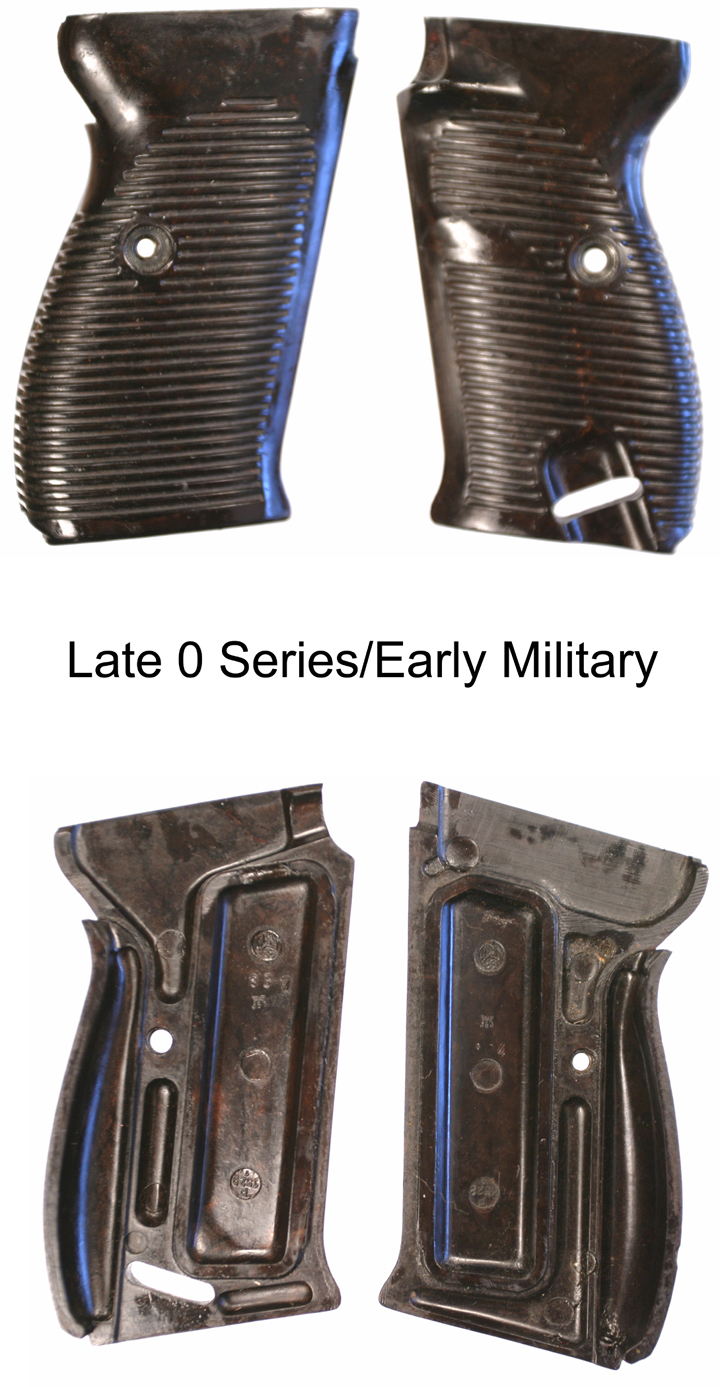 The last of the experimental 0 series had military style grips that followed the rest of the production. They are now marked 1528/29 for mold markings in the lower circle. The MPD code is moved to the top of the grip with the serial number and inspection stamp.